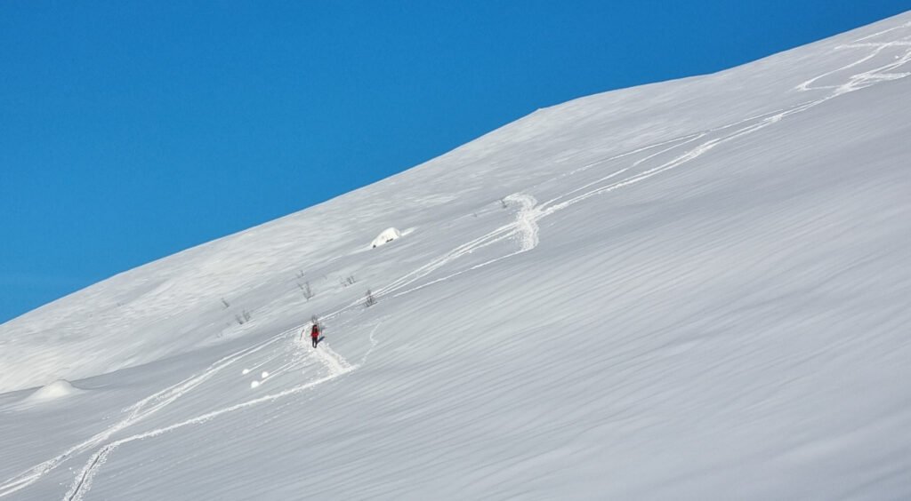 Lähdin itse katsomaan myös miltä reitti näyttää, mutta totesin käänyväni hieman loivempaan paikkaan ja tekeväni oman uran. Vaan on urakka. Lumi on raskasta edellispäivän plussakelin ja auringon vuoksi, ja kun uutta lunta oli tullut reilusti. Suksi upotti sen 35-45 senttiä joka askeleella. Ei olisi mikään helppo aamureippailu! Tovin ihan hyvää reittiä tehtyäni huomasin, että Mariuskin kääntyi takaisin perääni. Hyvä niin, jos tulevat päivät olisi tällaista lunta. Kaksin kävisi liikkuminen helpommin. Toden totta, viimein reilun tunnin puolen kilometrin mäkeä noustuamme huomattiin, ettei lumi olisi sen parempaa ylempänäkään. Löydettiin sentään joku vanha jälki, jonka seurailu oli hieman vaivattomampaa.