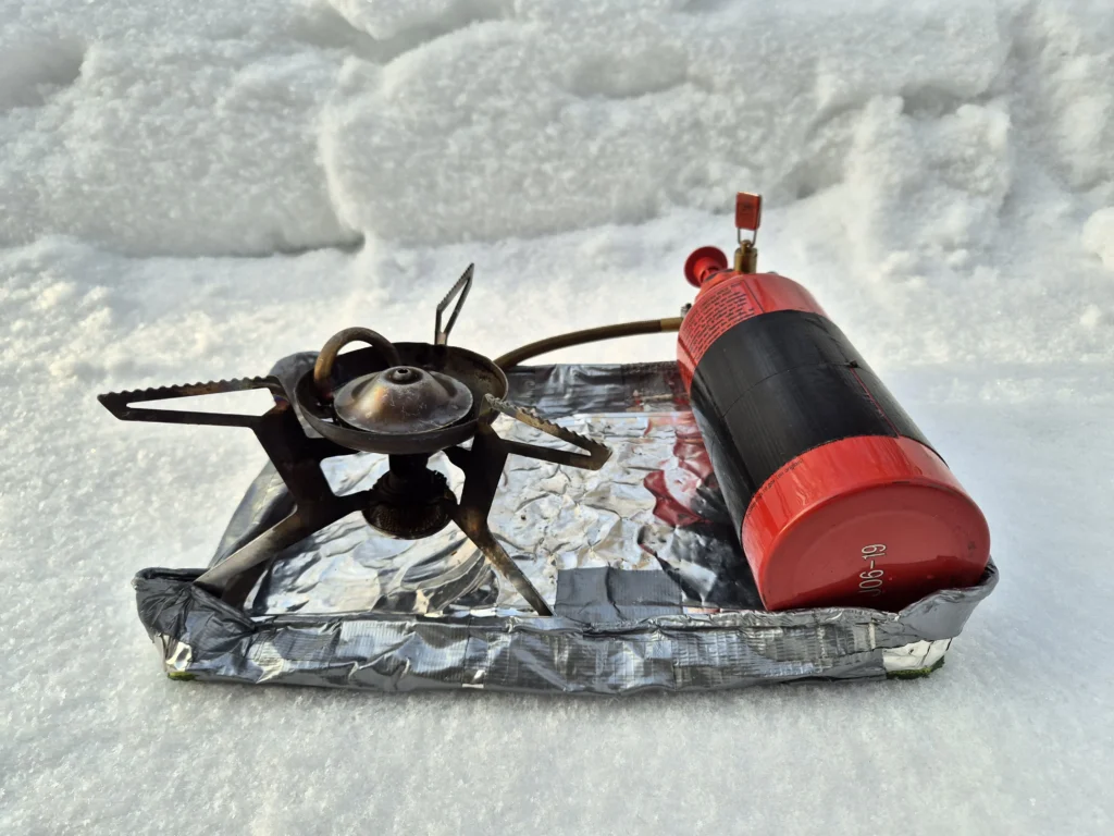 En siis käytä keitinlaatikkoa – mitä käytän? Keitinlaatikon sijaan käytössäni on kevyt alusta keittimen alla. Alustan tarkoitus on, ettei keitin käytön aikana uppoa hankeen kuumentuessaan. Yleensä keittimen mukana tuleva metallinen läppä riittää, ja kestää myös yllättävän kauan. Käytän tällaista alustaa vaeltaessani rinkan kanssa. Moni on askarrellut vastaavan alustan hiilikuitulevystä tai ohuesta vanerista.