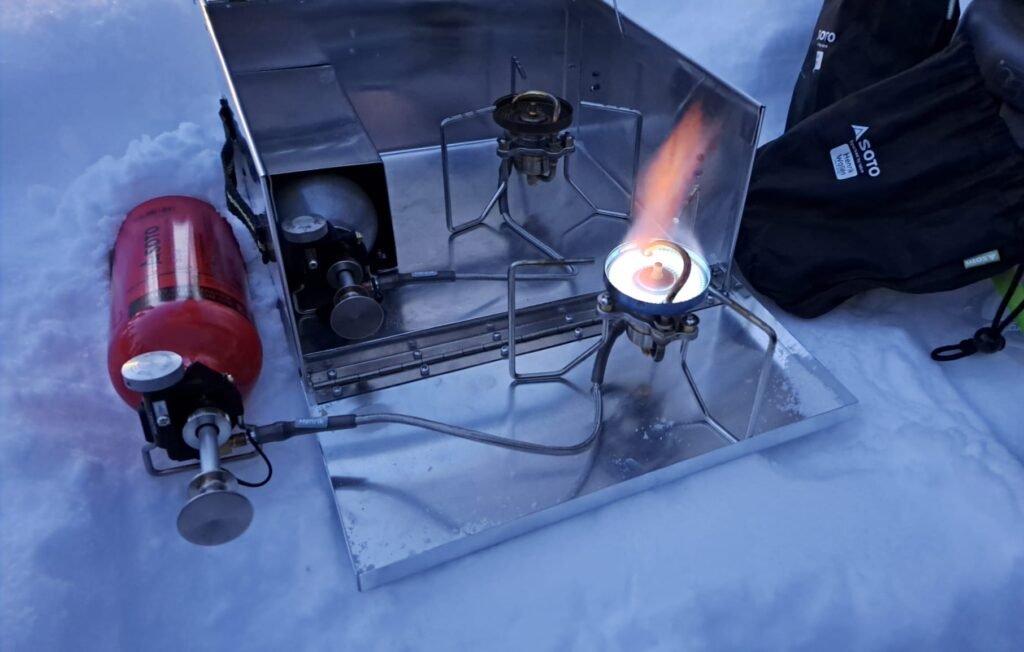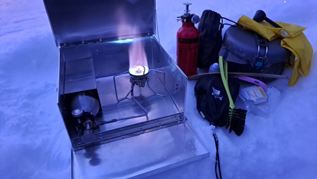 Käytän bensakeitintä lähinnä teltan eteisessä, jossa riskit ovat huomattavasti pienemmät kuin sisäteltan sisällä, joten en kaipaa erillisiä seiniä mukaani keittimen ympärille. Eteisessä keitin on mahdollista kaivaa syvemmälle lumeen, jolloin lieskoille jää tilaa niin, etteivät ne esilämmityksen epäonnistuessakaan osu teltan seinään. Lisäksi kuopan reunat on aina helposti kipattavissa lapiolla keittimen päälle, jos keittimeen tulisi vakava vika.