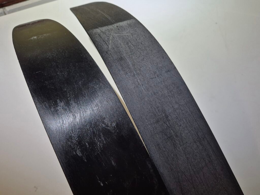 Karkea lumi kuluttaa puista pohjaa nopeasti. Pehmeällä hangella terva kuluu hitaammin eikä pohja mene uurteille.